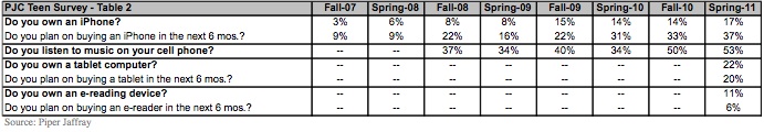 Исследование, проведенное фирмой Piper Jaffray, установило, что 22% подростков в США являются обладателями планшетов. Кроме того, 17% владеют смартфонами iPhone разных поколений и еще 37% планируют приобрести iPhone в течение полугода.